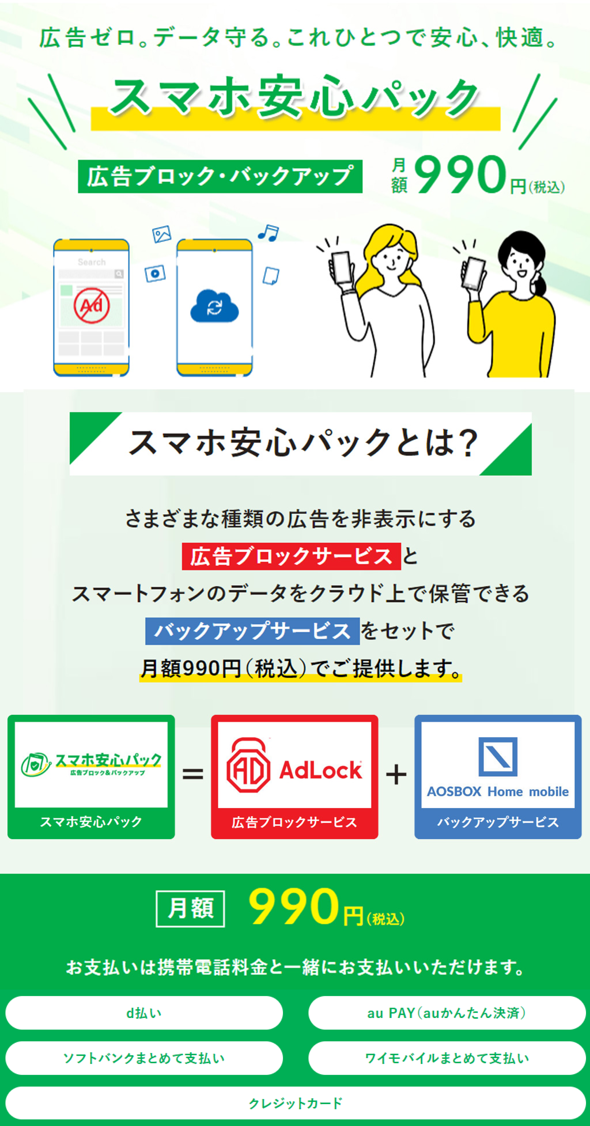 スマホ安心パックは、広告ブロックサービスと、スマホのバックアップサービスが、セットでご利用できるサービスです。